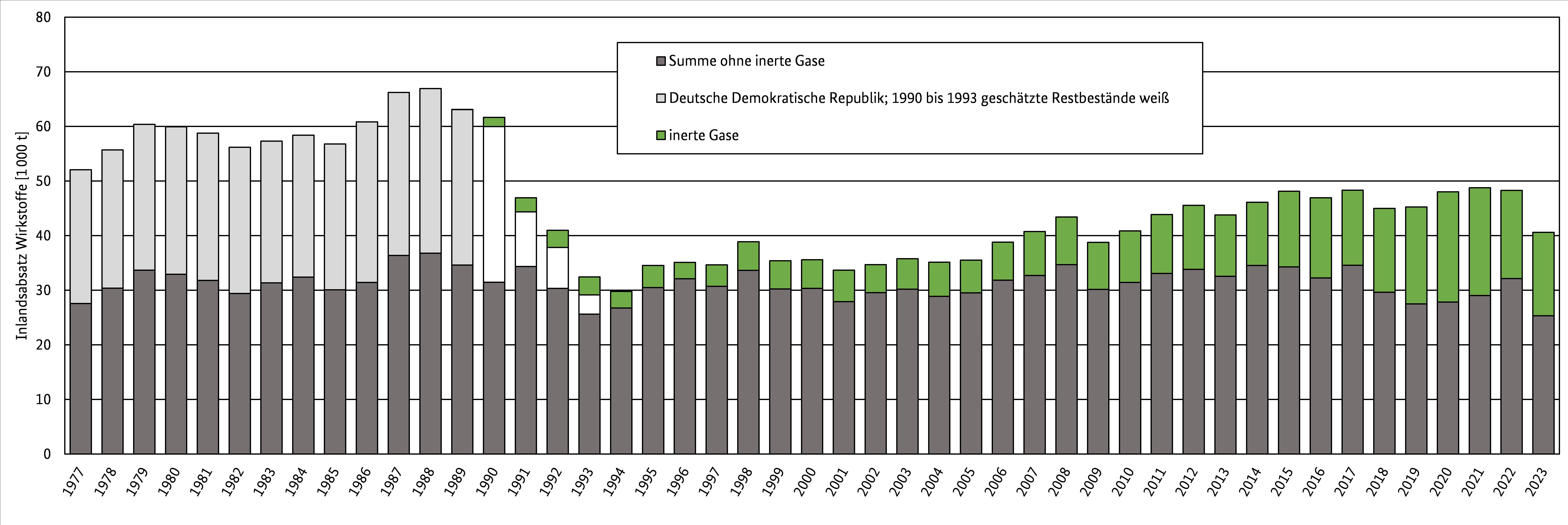 Betrachtet man die Abgabemenge ohne inerte Gase, so wurden 2023 insgesamt 25.295 Tonnen Wirkstoffe abgesetzt. Das entspricht einem Rückgang um 21,3 % im Vergleich zum Vorjahr. Bezogen auf den Mittelwert der Jahre 2013 bis 2015 hat die Absatzmenge der Wirkstoffe ohne inerte Gase bis 2023 um 25,1 % abgenommen. Für 2022 lag der Rückgang, bezogen auf den Mittelwert der Jahre 2012 bis 2014, bei 4,4 %.