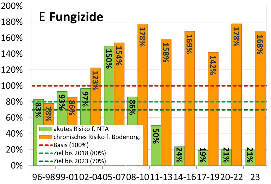 Bei den Fungiziden konnte eine deutliche Zunahme des Risikos für Bodenorganismen gegenüber dem Basiszeitraum beobachtet werden. Bis zum Bewertungszeitraum 2023 nahm der Risikoindex für Bodenorganismen um 68 % zu. Das Risiko der Nicht-Ziel-Arthropoden (NTA) zeigte dagegen bis zum Bewertungszeitraum 2023 eine deutliche Abnahme um 79 %.