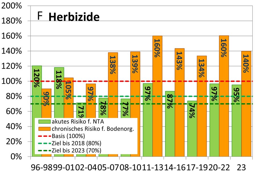 Bei den Herbiziden zeigen die Risikoindizes eine Zunahme des Risikos für Bodenorganismen. Im Bewertungszeitraum 2023 nahmen die Indizes gegenüber dem Basiszeitraum um 40 % zu. Das Risiko für NTA dagegen nahm um 5% ab.