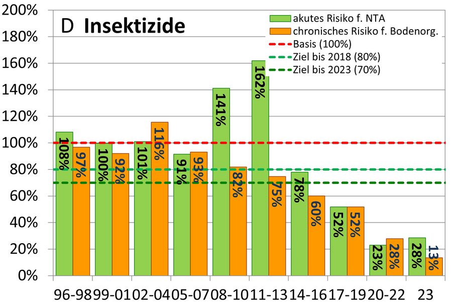 Die Trendbilder zeigen bei den Insektiziden eine deutliche Abnahme des Risikoindex für Bodenorganismen und Nicht-Ziel-Arthropoden (NTA) Das Risiko für NTA nahm bis zum Bewertungszeitraum 2023 um 72 % und das Risiko für Bodenorganismen um 87 % ab.
