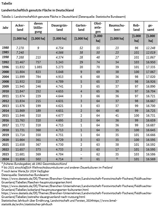 Von den betrachteten Nutzungsformen nahmen 2024 im Vergleich zum Vorjahr die Obst- und Rebanlagen leicht ab. Das Dauergrünland nahm leicht und die Stilllegungsflächen nahmen deutlich zu. Mit 165.689 km² werden rund 46,3 % der Fläche Deutschlands (357.683 km²) bewirtschaftet.